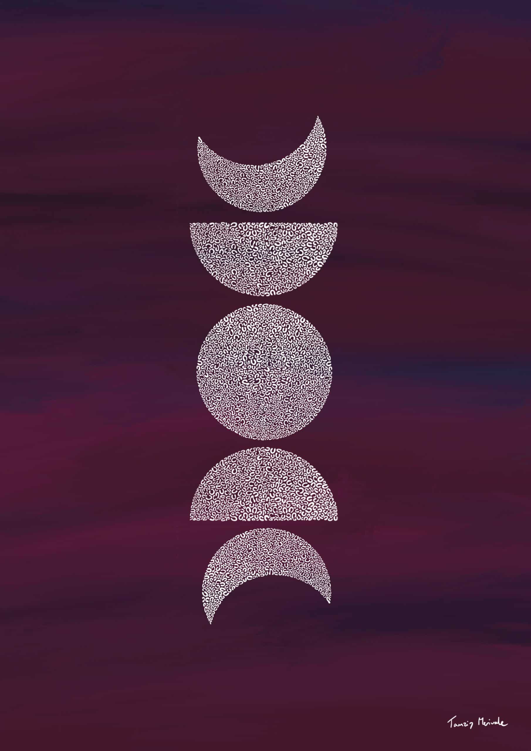 The artwork shows five moons stacked in a single column. Each lunar disc is illustrated in a U-shaped motif. The colour palette consists of dark pinks and purples, while the moon is drawn in soft, luminous white.